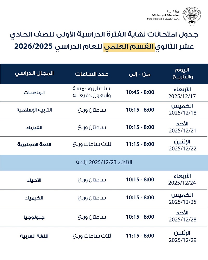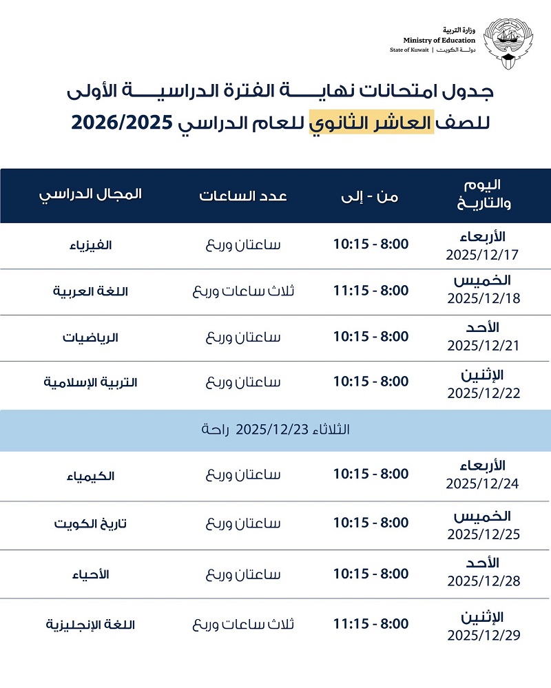 ووفقاً للجداول المعتمدة والمنشورة على موقع «الأنباء» الإلكتروني، تنطلق اختبارات الصفين العاشر والحادي عشر في 17 ديسمبر 2025، فيما تبدأ امتحانات الصف الثاني عشر في 4 يناير 2026، وذلك انسجاماً مع الخطة الزمنية المعتمدة للعام الدراسي.