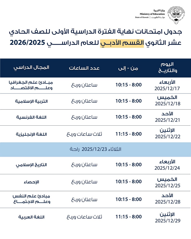 اعتمد الوكيل المساعد لقطاع الشؤون التعليمية بوزارة التربية م. حمد الحمد جداول امتحانات الفصل الدراسي الأول للعام الدراسي 2025–2026 للمرحلة الثانوية، والتي تشمل الصفوف العاشر والحادي عشر والثاني عشر في الأقسام العلمي والأدبي والتعليم الديني.